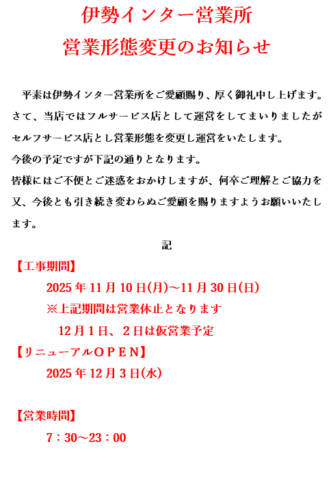 伊勢インター営業所 営業形態変更のお知らせ