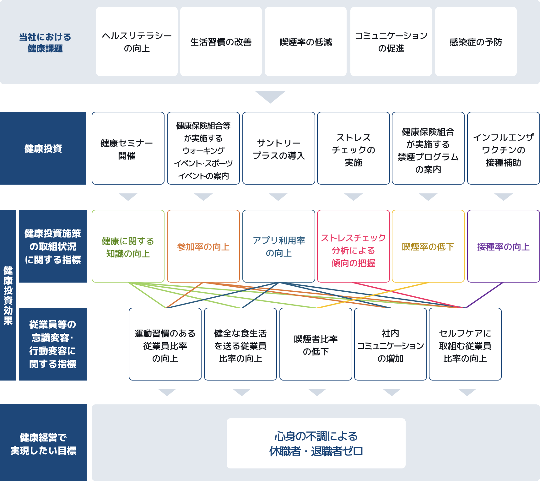 そのため、健康の保持・増進を経営課題の一つとして捉え、経営トップのリーダーシップのもと、全社一丸となって健康経営に取り組み、心身の不調による休職者、退職者ゼロを目指します。